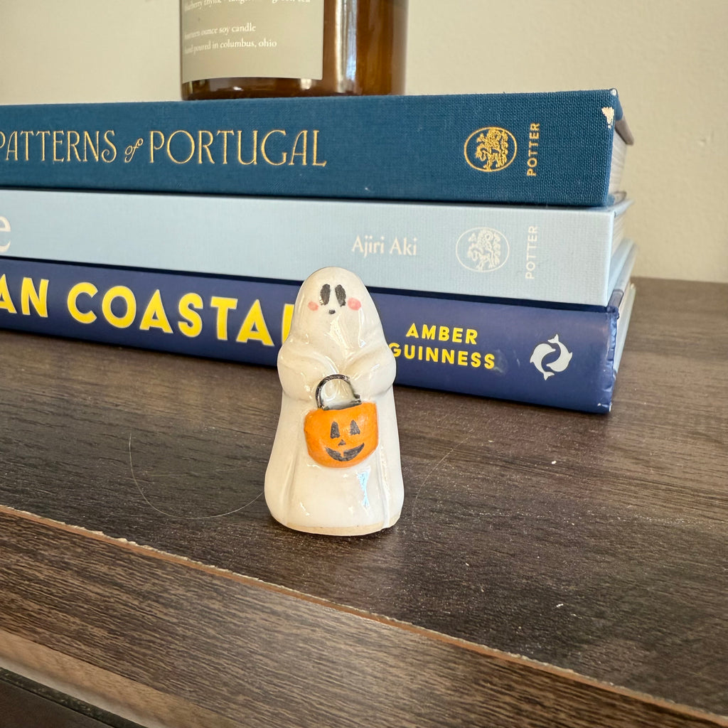 The sweetest little lost soul! Featuring either a single bat, pumpkin on its head, a jack o lantern basket, or a plain full size or plain mini ghostie. They can vary in size a bit but is around 1in tall give or take a little, and the plain baby ghosties are about 1/2in tall. These cuties are purely decorative and is sure to add charm to your life.